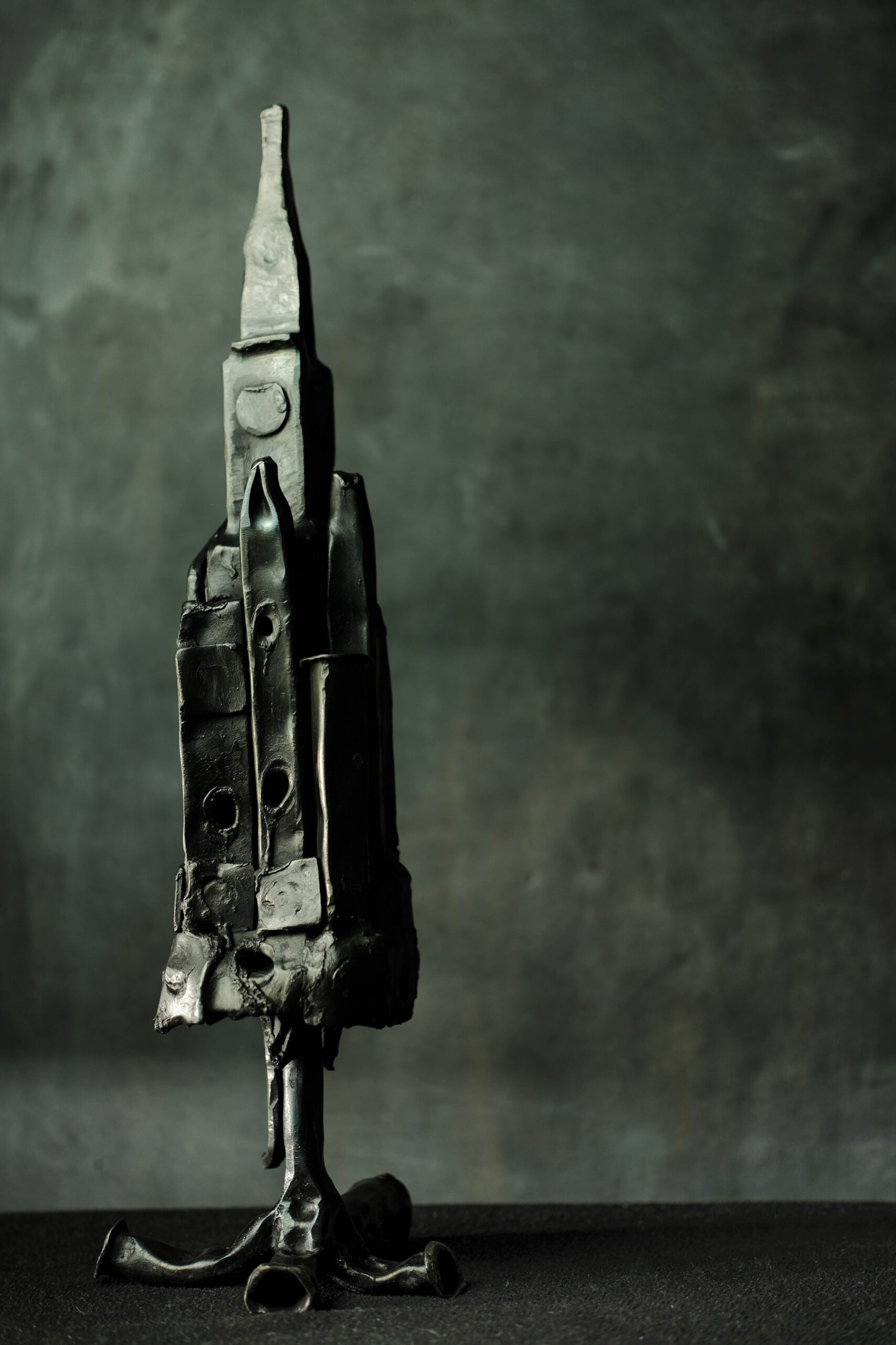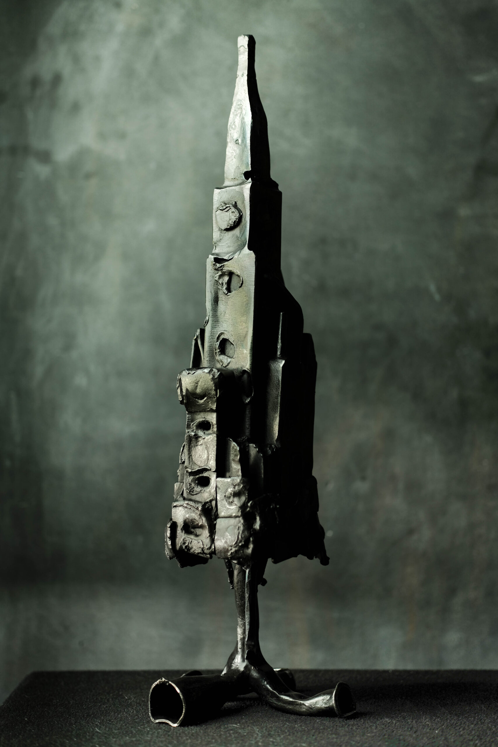 Nieregularne kształty, otwory, warstwy metalu i strzeliste wieże tworzą hipnotyzującą kompozycję, która wygląda jak wizja futurystycznej metropolii lub postapokaliptycznych ruin. To unikatowy obiekt sztuki, idealny dla osób ceniących eksperymentalną formę i nowoczesny design.