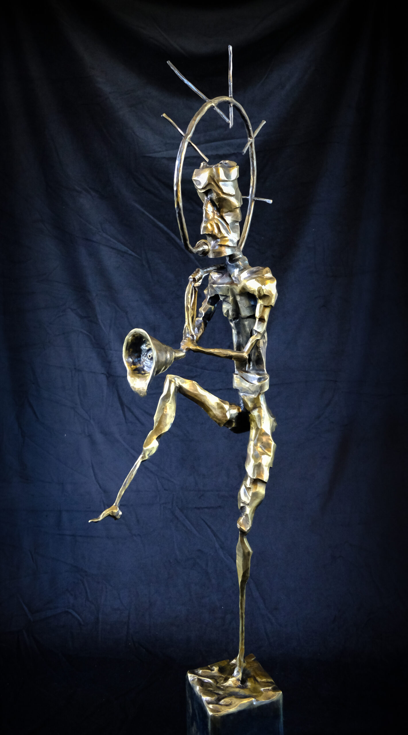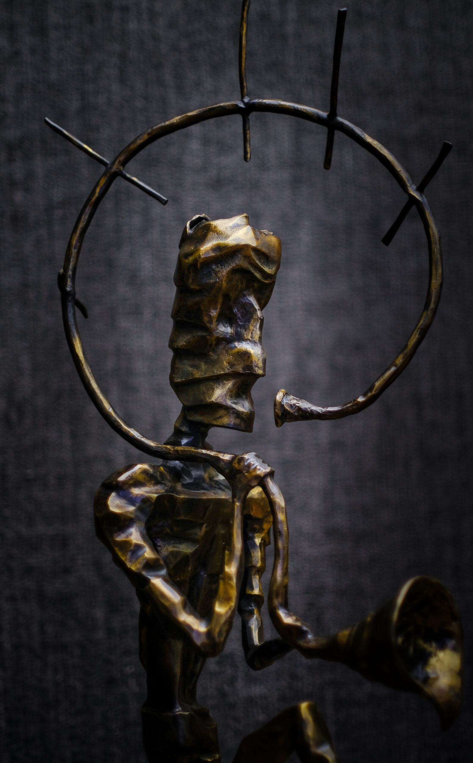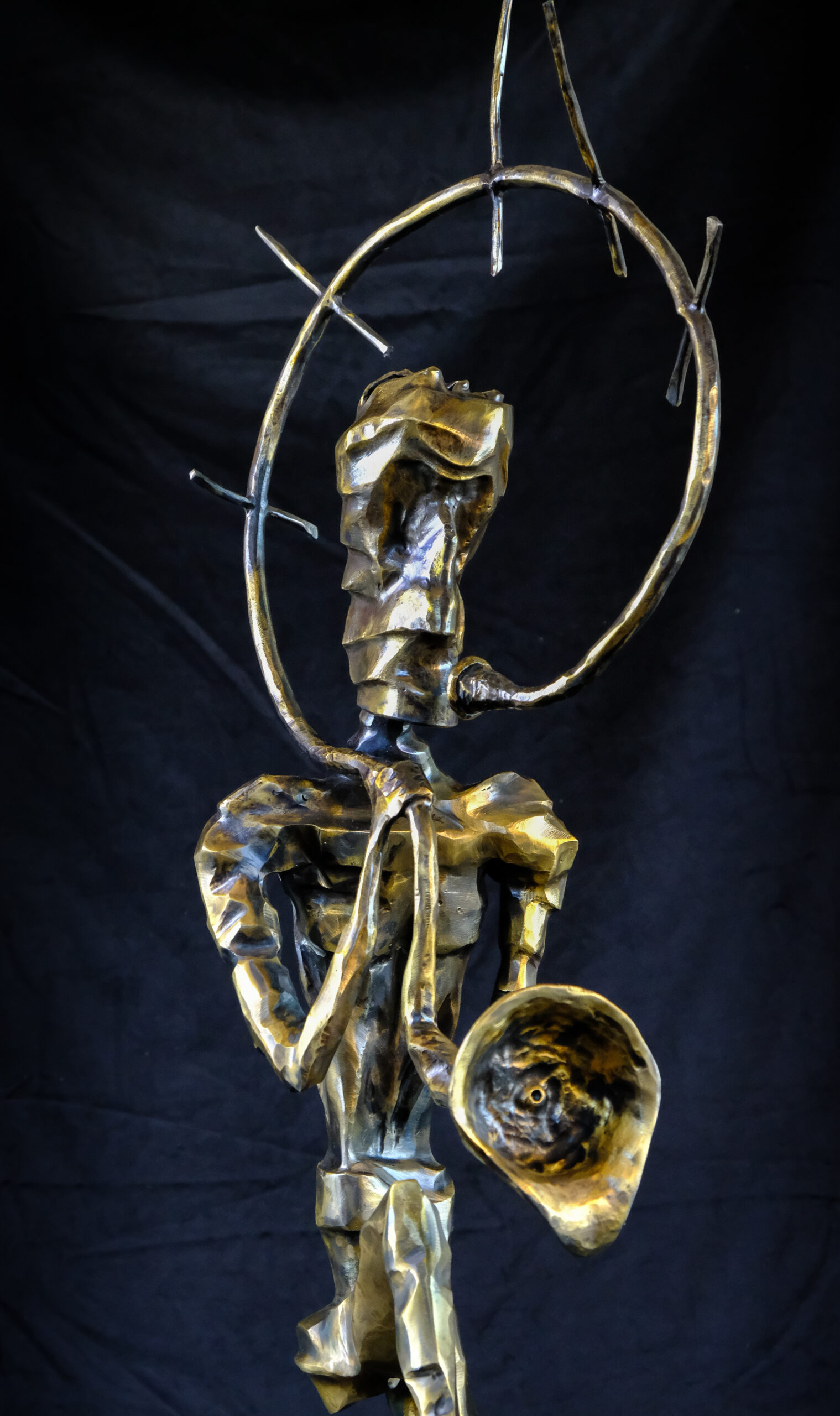 To obiekt, który wygląda jak postać narodzona w ogniu i hałasie współczesnego świata. Metalowa sylwetka, napięta jak struna, zamrożona w ruchu między krokiem a krzykiem. Trzyma w dłoni instrument lub symbol – jakby próbowała nadać dźwięk temu, czego nie da się już wypowiedzieć słowami.