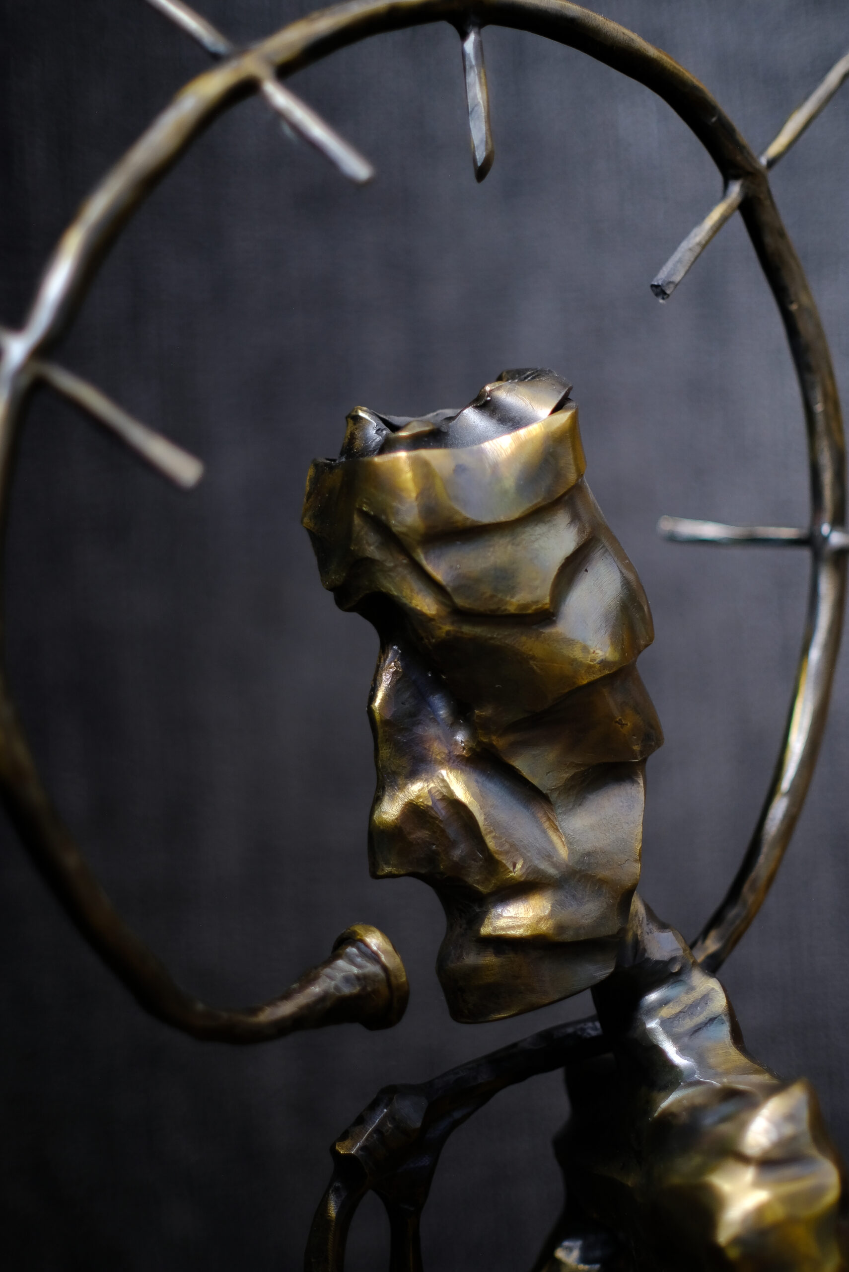 Forma jest brutalna i szczera. Stal nie prosi o uwagę. Każde pęknięcie powierzchni, każde załamanie linii przypomina, że piękno może być niepokojące. Obręcz wokół głowy przywodzi na myśl aureolę, klatkę albo pułapkę — znak świętości, obłędu lub zniewolenia. Interpretacja należy do widza.